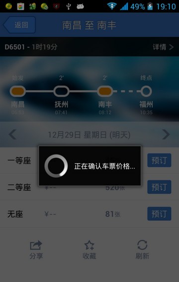 选择适合自己的时间段,点击进入,这里我们可以选择座位来预定,点击预定后,系统在确认车票价格(稍微等待会)。