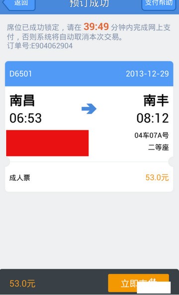预定成功之后并提示我们必须在45分钟内完成,确认订购的火车票信息无误后,我们点击底部的“立即支付”前往支付页面即可,支持完成后火车票就到手了啦。