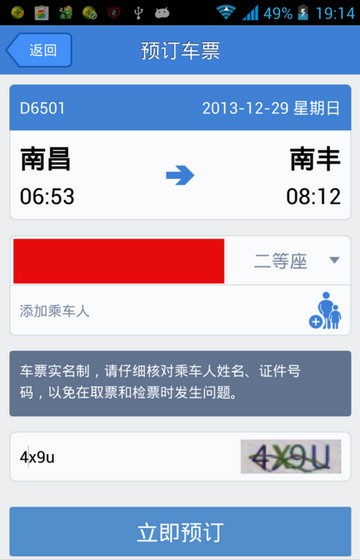 进入预定界面,这里我们添加乘车人,填写上验证码,最后点击底部的“立即预定”就可以开始预定购买火车票了