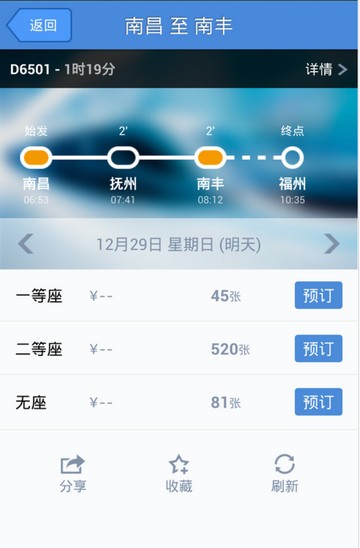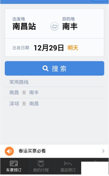 这里我们可以看到界面比起“铁路12306”来说非常简单,直接选择出发地和目的地(这里搜索没有热点选择,所以需要我们自己输入地点来搜索),再选择出发日期,然后搜索即可,之后找到适合自己的乘坐车次: