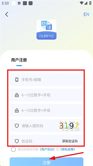 3、在用户注册页面填写相关信息后,点击注册完成注册操作。