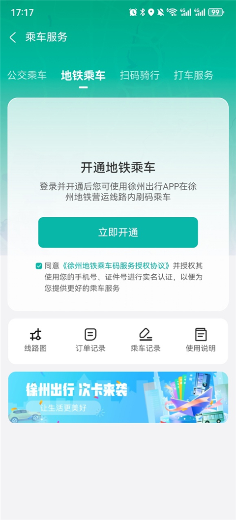 2、点击地铁乘车服务进行授权开通。