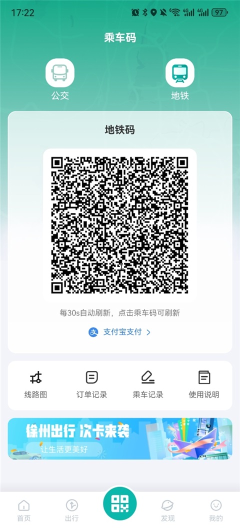 6、返回徐州出行App后点击乘车码中的地铁即可刷新出地铁码。