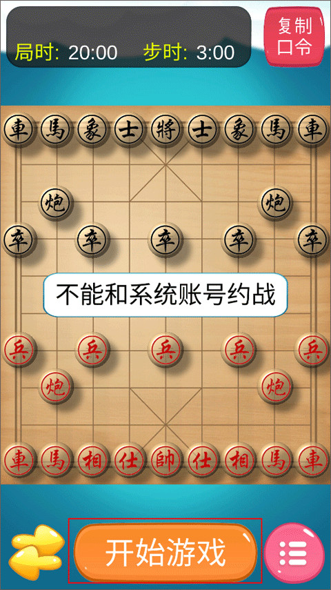 2、点击下方的“开始游戏”按钮,就可以复制口令给自己的好友来进行约战了,不过需要注意的是,不能和系统账号约战。