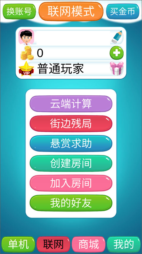 在“联网”界面中可以看到云端计算、街边残局、悬赏求助、创建房间、加入房间以及我的好友,先点击我的好友。