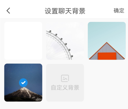 3、你可以选择软件自带的,或者自定义背景。选择软件自带的话点击图片在点击右上角的确定,自定义背景在相册选择好后会自动跳转到聊天页面。