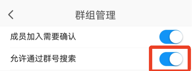 此位置在:点击群聊界面右上角-【群组管理】-【允许通过群号搜索】。