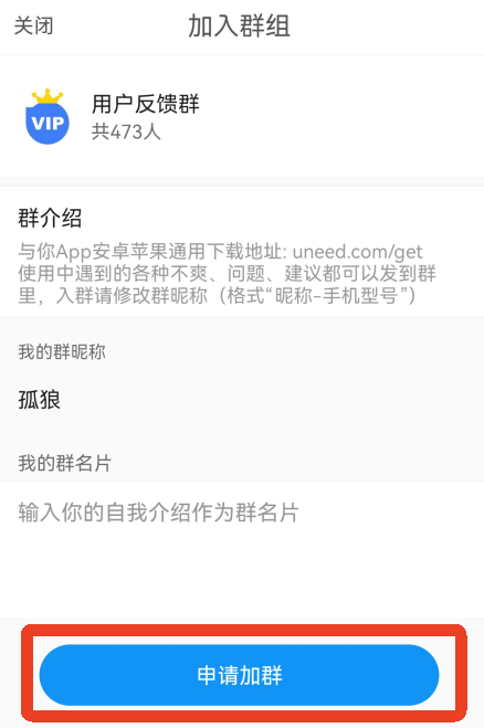 3、进入到群组介绍页后点击【申请加群】,等待通过就可以了。