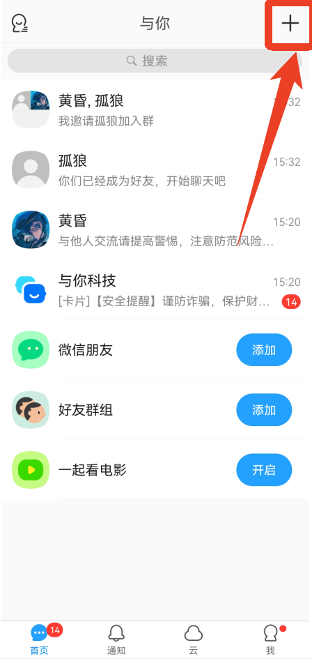 1、在【首页】点击右上角的【+】号,再点击第一个【添加朋友/群】。