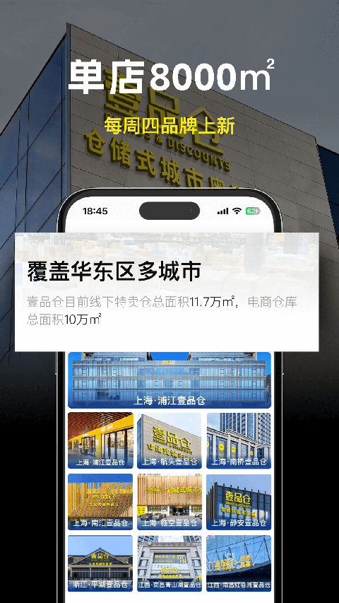 壹品仓成立以来一直保持周周都有新品牌,每周上新会在公众号、app、直播、私域等多渠道进行公告,吸引了大批量高粘度粉丝。壹品仓目前已积累用户2000 万,布局 上海/江西/浙江等地区10 + 家门店特卖仓,总营业面积达 11.7 万㎡。