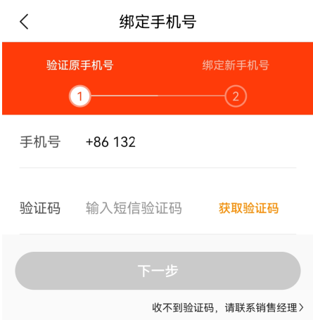 3、第一步我们需要验证原手机号,点击【获取验证码】并输入,再点击下一步。