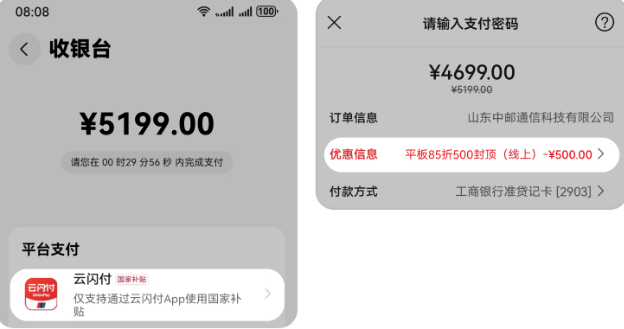 支付方式选择“云闪付”,付款界面可查看政府补贴优惠信息。
