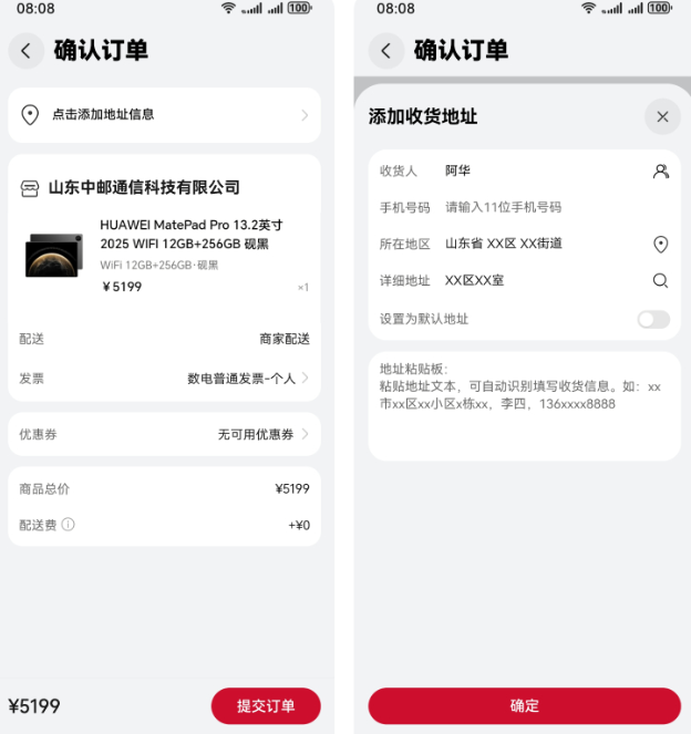 填写参与国补省份内收货地址,地址需精确至门牌号,点击“提交订单”。国家补贴订单仅支持特定物流公司承运,若物流公司无法送达地区,则代表此地区将无法参与国家补贴活动。