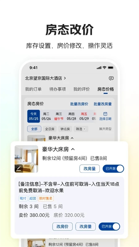 美团酒店商家版是美团旗下开发的一款专门为酒店商家打造打发布的安卓手机平台。该软件为美团酒店的商家们提供管理和收账等各种好用的功能,从此摆脱电脑束缚,让您可以随时随地查看和管理与美团的合作。同时美团酒店商家版还支持一键查看项目数据、搜寻周边同行信息、回复评价、更改房态等特色功能服务,并且平台界面简洁干净,操作简单方便,相信它帮助您更好的管理酒店,让您经营轻松,生意爆红!