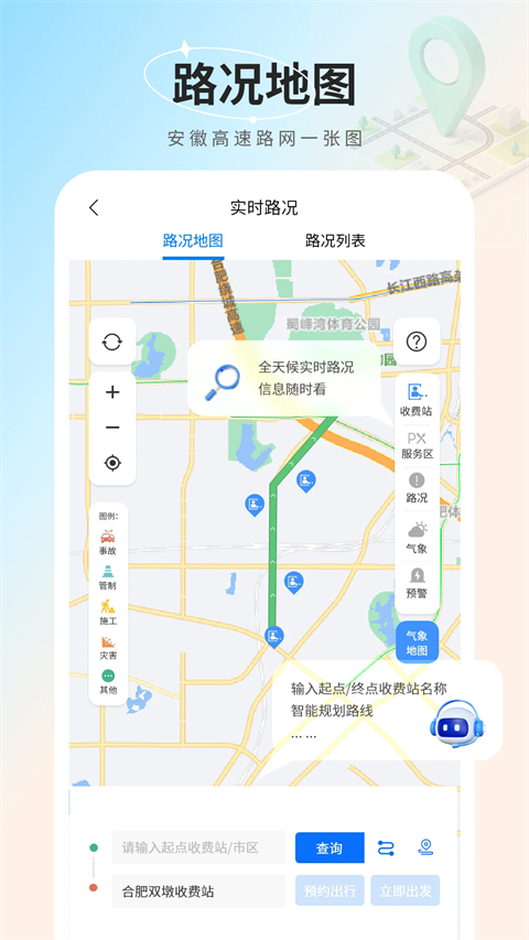 3. 实时路况查询,实现路况查询、出行路径规划、预约出行、路况订阅、导航与语音播报,快速查看高速线路沿途充电桩、加油站、服务区、收费站、路况、省/市/县天气预报与天气预警信息。