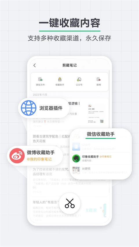 - 轻松聚合微信、微博、新闻客户端和网页信息,随手捕捉每一寸灵感