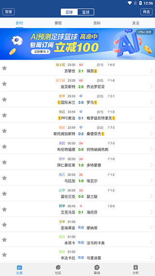 1、进入软件之后,就可以在【比赛】页中看到足球或者篮球的各项赛程。