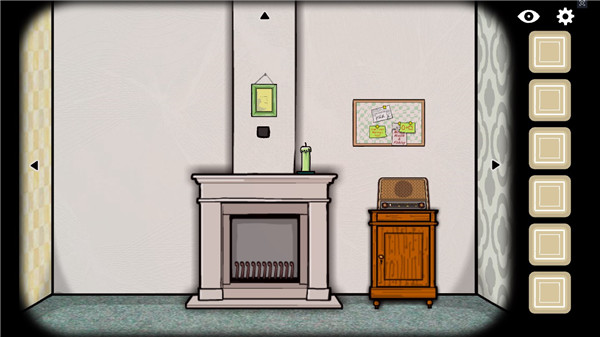 3、我们向右转,来到了火炉室,发现火炉竟然已经是烧的了,这下更恐怖了,明明没人啊。这时候我们更需要淡定,点开墙上的备忘板,可以发现纸片下有一片相片碎片,往下看,发现有一台电视,但是点开花屏貌似没有什么用。到这里为止,许多小伙伴可能就觉得这房间没什么可以探索了,可是,最关键的就在电视上,点开电视,发现电视的换台可以用,分别对应了数字,你按到4还是3的时候,电视就有画面了,都是显示的有关于数字的画面,我们只要按照他的画面提示,不停地换对应数字的台就好,最后就能取得方块啦。