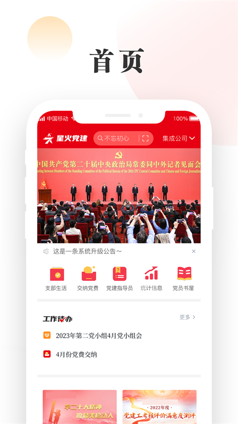 星火党建APP是一款由中国移动面向单位内全体党员打造的党建学习平台,提供组织工作、党务工作、教育工作、宣传工作、Al助手小星、统计分析等功能,其中涵盖组织基本信息的查看、三会一课会议统计及会议签到、党费缴纳、党内数据统计、公告查看、党课学习等服务!