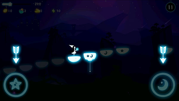 玩家需要观察屏幕上白色台阶上的星月图案,按下屏幕左下方和右下方对应的星月图案。如果键正确,角色前进一次并触发相应的钢琴声。按错键将触发暂停惩罚。