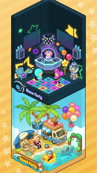 3、小梦幻的装饰,可爱的治愈,开始和猫、狗、鲨鱼和鬼魂玩,各种派对嘉宾和各种有趣的道具加入他们,随时随地开始