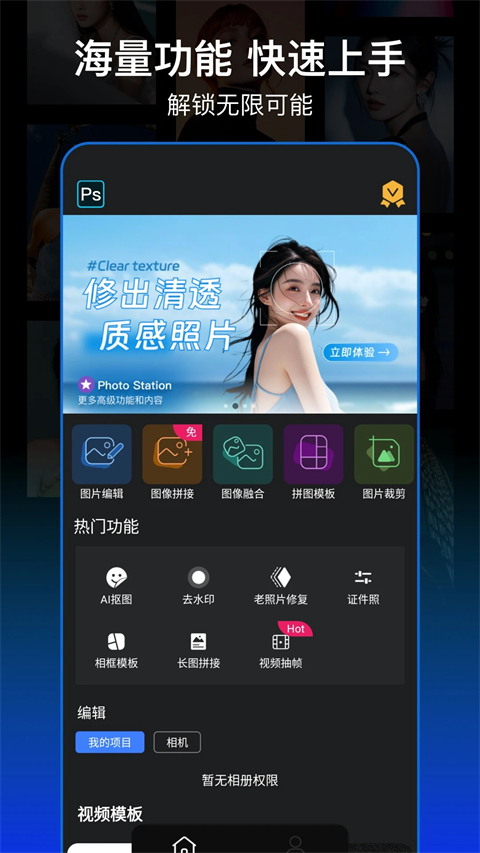 PS图片处理app是一款功能强大的在线修图应用,提供了丰富的编辑工具,包括裁剪、滤镜、调色、人像合成、换背景等,让用户可以快速美化照片,实现专业级的修图效果。PS图片处理还提供了专业的调色工具,让用户可以像专业的PS大师一样调整图片的色彩效果。无论是想要玩转自拍、制作精美证件照,还是进行特效制作和照片编辑,PS图片处理官方版都能满足你的需求,让你轻松成为修图大师,让你热爱P图修图!