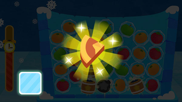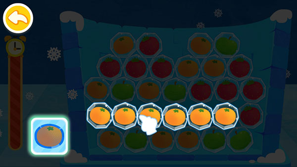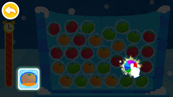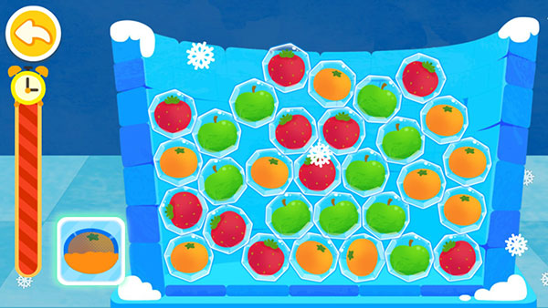 温度过低,水果被冻住了。宝宝认真找找,连出相邻的3颗同类水果,就能消除冰块,解救水果,一次性解救4颗及以上水果,有小星星。