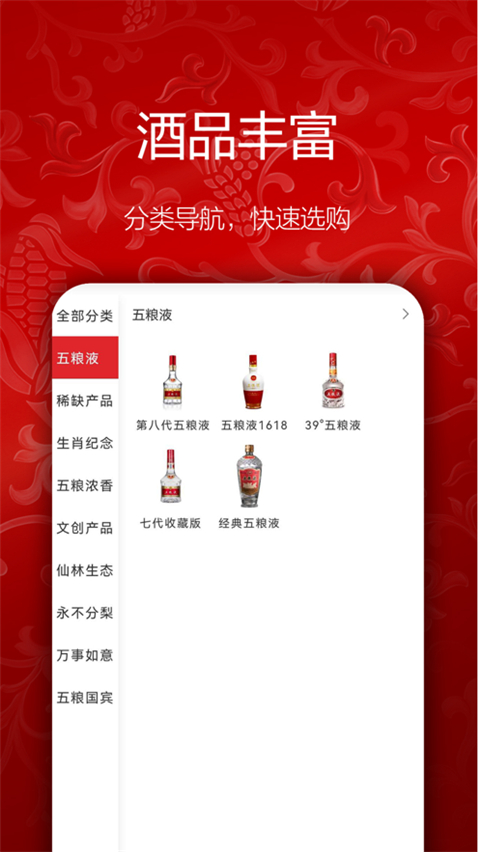 包括白酒、红酒、保健酒等全系列商品,用户可以在应用中方便地选购心仪的产品。