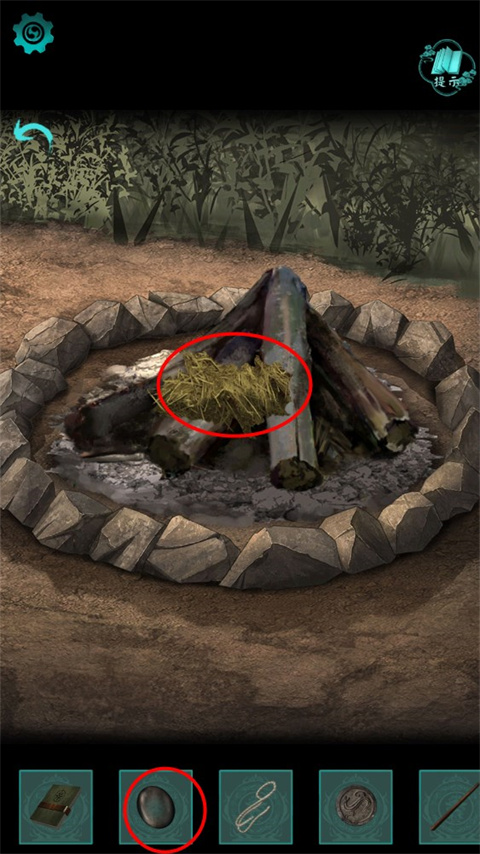 16、(帐篷外)点击火堆,放上【一把枯草】,使用【镜片】,让阳光透过镜片点燃枯草