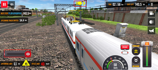 7、当我们需要刹车是,可以拉下右下角的brake按钮,拉动他就可以完成制动,右上角还有切换火车控制视角、喇叭、等按钮,完成游戏的任务获得胜利。