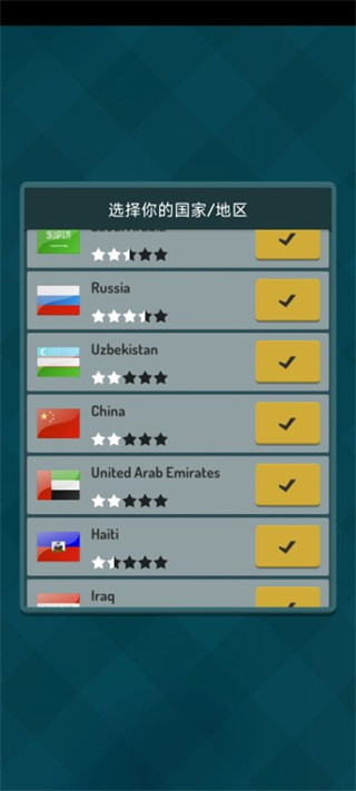1、下载进入冠军足球明星游戏,首先选择你的国家;