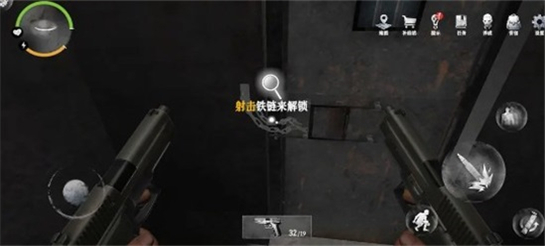 8、回到走廊,走到最前面有一扇门,换上枪射击铁链即可开门。
