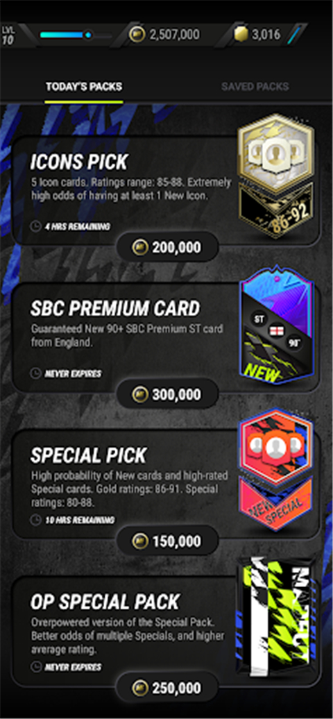 分为TODAYSPACKS和SAVEDPACKS,todays下面又分为每天限量和不限量两类,限量建议每天买完,不限量开服建议买银卡包和80两个包,Saved包是你任务,奖励获得的,都会在这。