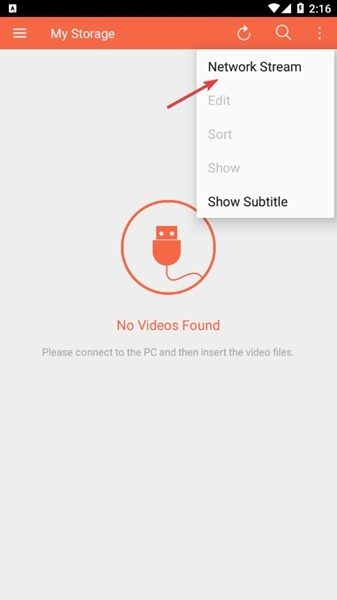 2、不过我们又在线播放模式,所以我们只需要点击右上角的三个点就可以看到下图所示的【network stream】。
