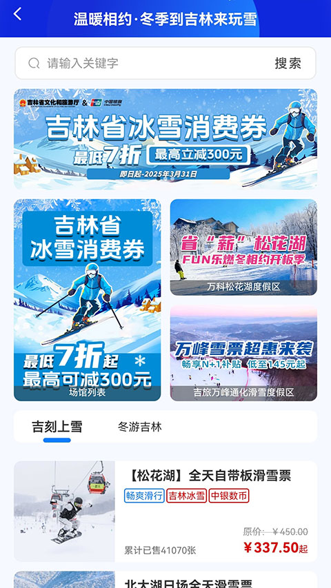 1、进入软件首页点击中银专区可以快速进入中国银行冰雪专区,小伙伴们也可以选择其他,比如吉林专区、河北专区等,由于各个专区的购票方式大致相同,所依接下来将以中银专区为例,为各位小伙伴进行介绍。