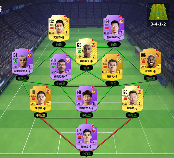 4、华南的紫卡全是恒大队的,所以他们的阵型连线不是黄色,是绿色!很绿很绿的那种绿色,羡慕不羡慕?