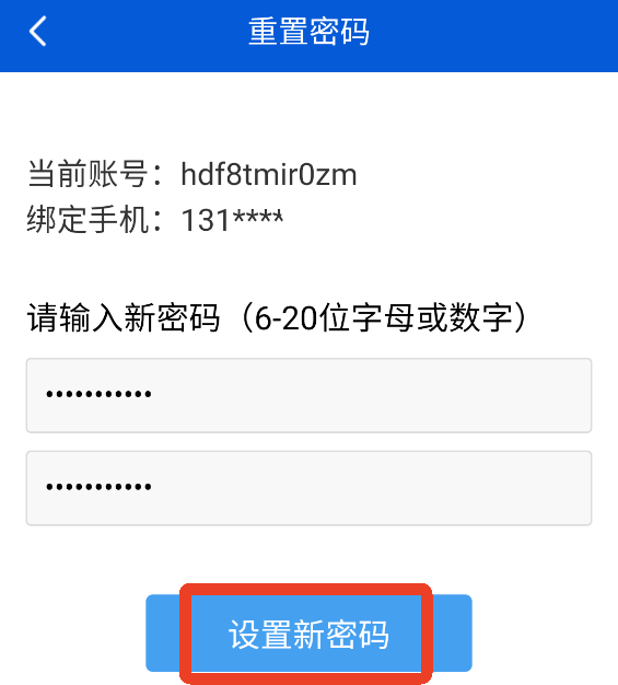 4、直接输入两次你的新密码,需要6-20位字母或者数字,输入完成后点击【设置新密码】。