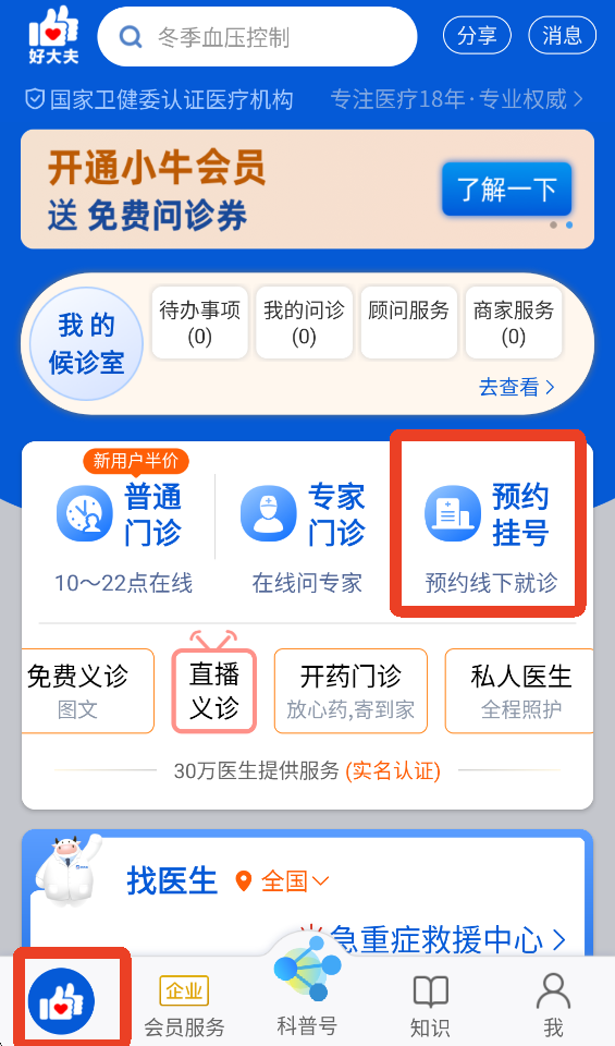1、在【首页】点击【预约挂号】,可进行预约线下就诊。