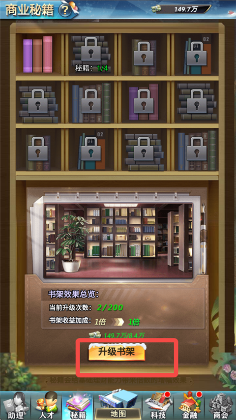 秘籍为理财收益提供倍数加成。主场景上的建筑越多,等级越高,秘籍提供的收益加成越大。