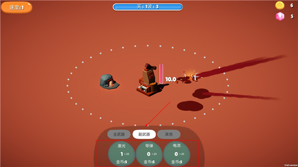 3、当敌人出现时炮塔会自动攻击,当敌人接近时就会破坏炮塔,炮塔被摧毁则游戏失败。