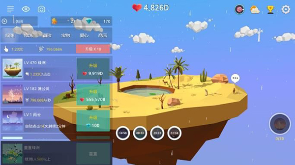 绿洲要生长需要爱心,我们可以通过点击来直接获得爱心,随着爱心的点击,绿洲会升级有更多的建筑。