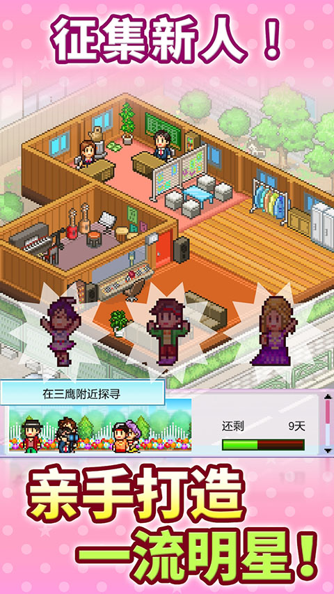 百万进行曲中文版是一款像素风格的模拟经营类手游。该款游戏延续了开罗游戏一贯的像素风格画面,游戏中玩家将化身为一家娱乐公司的老板,你的主要任务就是培养歌手明星,并利用广告媒体等手段来挖掘有潜力的新人。游戏中玩家还需要安排自己的歌手前往各地参加活动、制作唱片CD,召开粉丝见面会等等,不断增加人气,以此来赚取更多的金钱。值得一提的是,百万进行曲最新版中虽然画面简朴,操作简单,但是整体的玩法还是非常丰富的,玩家可以体验到明星养成的乐趣。感兴趣的小伙伴赶快下载试试吧!