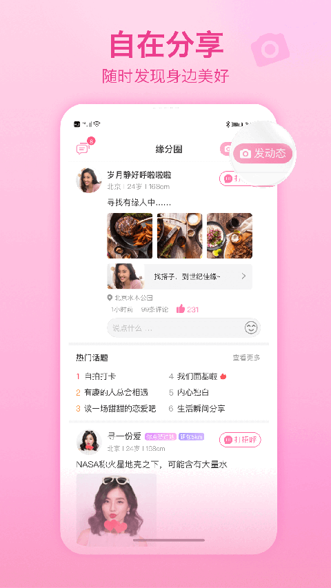 【缘分圈】发布动态遇见附近的ta,彰显你的个人风采,让你在人海中闪亮绽放