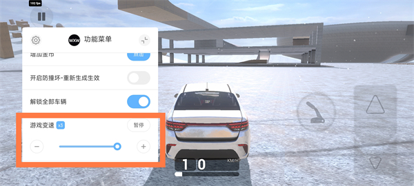 开启功能菜单后,可一键解锁全部车辆,并通过【游戏变速】自由调节节奏,无论是碰撞测试还是长距离驾驶都更加灵活。