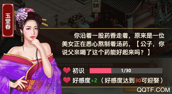 3.美人相伴,夜夜笙歌:玩家在游戏中可以通过剧情或者寻访触发随机事件结识不同的红颜,并且可以跟红颜培养感情,结为夫妻,生下孩子,也可以对子嗣进行教育培养,直至子嗣考取功名,成家立业。让玩家有很强的代入感,体验不同的人生。