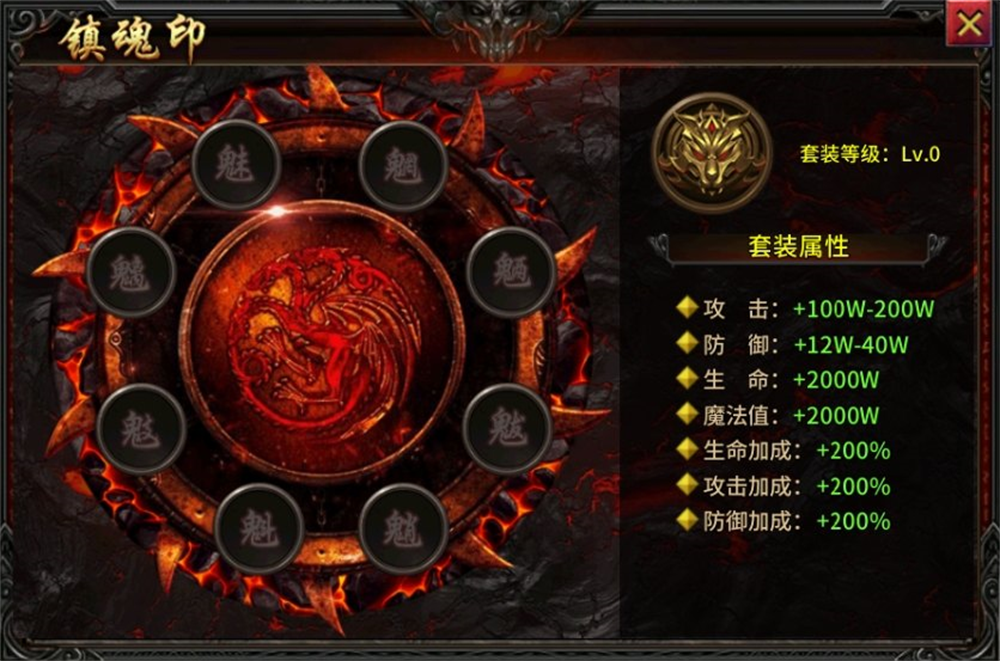 可以通过击败魔界地图【森罗鬼域】怪物获得镇魂印,装备一整套镇魂印可以激活额外套装属性。