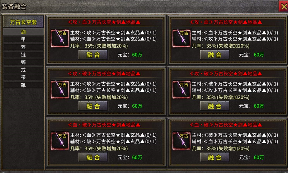 将两件单属性的装备融合成一件双属性装备,可以把攻击和防御属性装备融合成一件攻防兼备的装备,也可以将两把攻击属性装备融合在一起获得极致的输出装备。