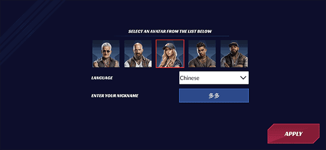 1、点击运行游戏后,在这里的Language中选择Chinese、输入你想在游戏中展现的昵称后选择并点击“APPLY”的按钮选项;
