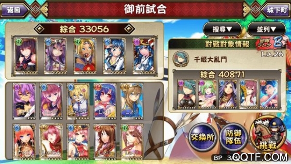 「御前试合」是一个提供玩家间互相竞争排名的战斗系统,玩家可藉由排名的来测试自己的实力,只要于「御前试合」打败所有玩家对手,就可以称霸游戏。「御前试合」每天将开放玩家挑战 3 次,每天系统会自动根据玩家的战绩排行来分发不同的报酬,玩家可利用获得的报酬至交换所中兑换武将、各种素材以及道具。