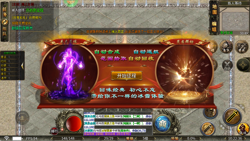 点击“开始征程”启用上线赠送的自动功能(拾取、回收等),实现无操作刷怪发育。